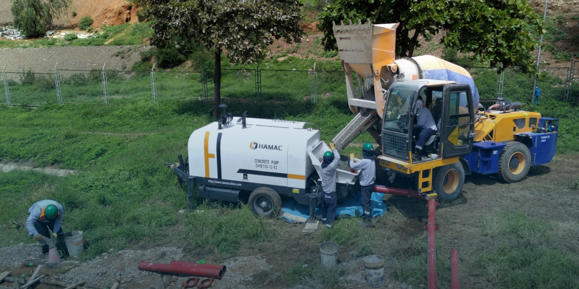 Maquinaria en obra: Hormigonera autocargable HMC350, bomba de hormigón diésel DHBT50.